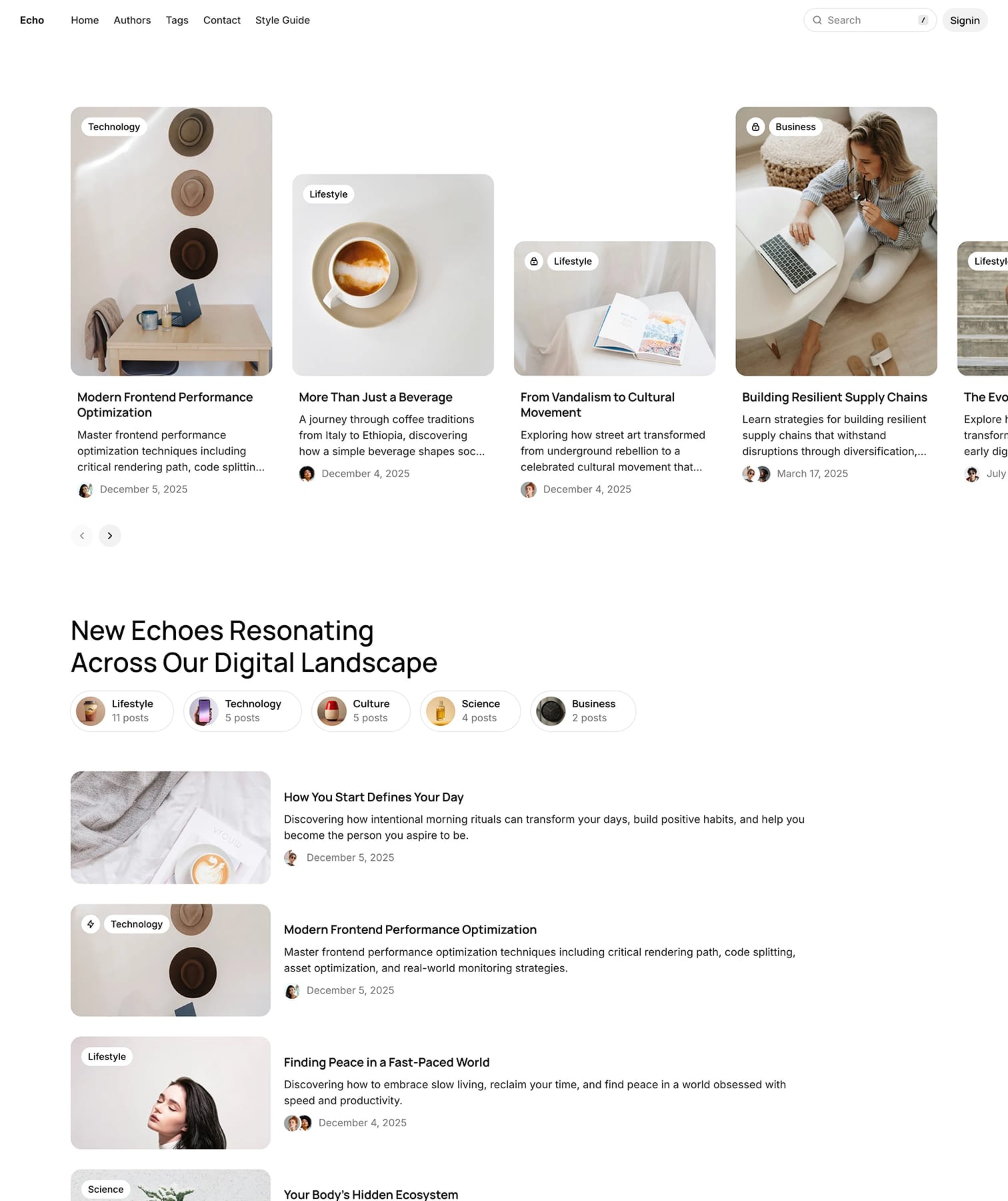 Clean editorial platform built for content creators managing diverse writing teams, featuring flexible homepage layouts, author profiles, and seamless category organization for modern publishing.
